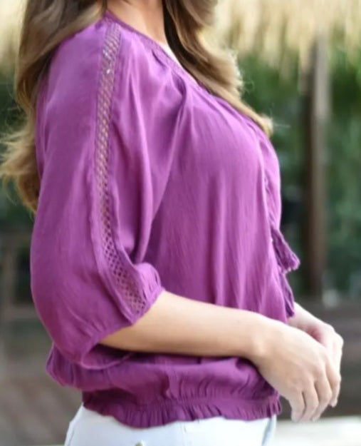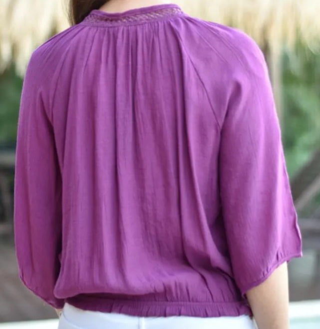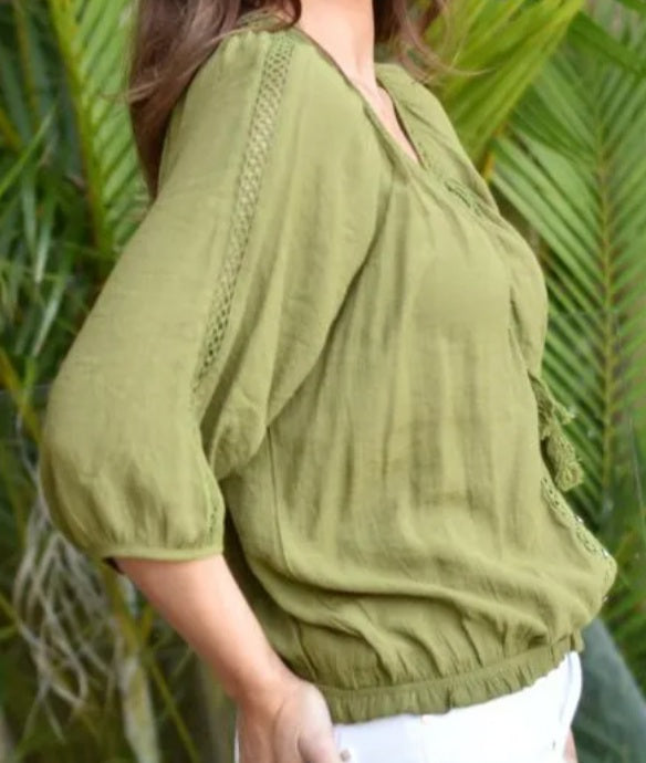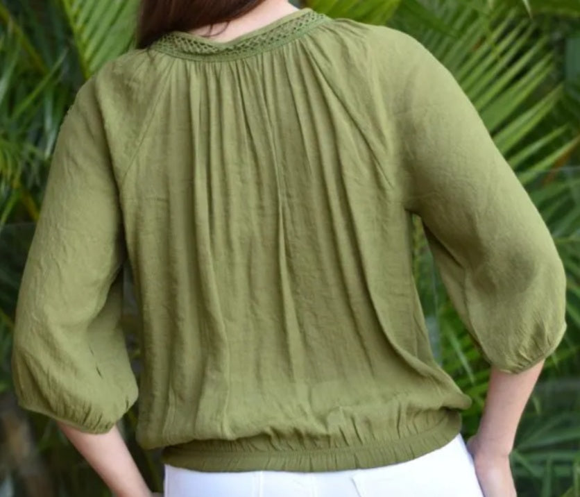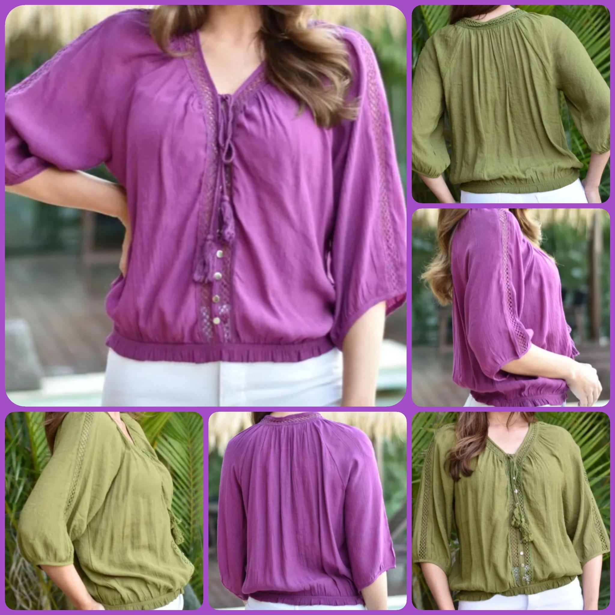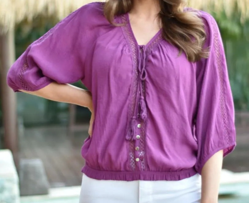 Get ready to be noticed wearing the flattering, peasant style, sunshine top from Zen Garden.