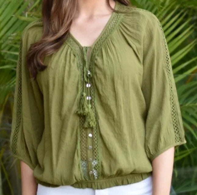 The stand out feature is the eye catching intricate ladder lace detailing on both sides of button front, around neckline, elbow length sleeves have a same ladder lace detail, silver look buttons and decorative front tassel ties and elasticised hemline complete the look.